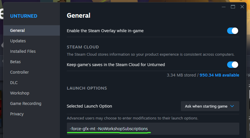 -force-gfx-mt: Use Unity's multithreaded rendering pipeline-NoWorkshopSubscriptions: Prevent asset conflicts from subbed workshop mods